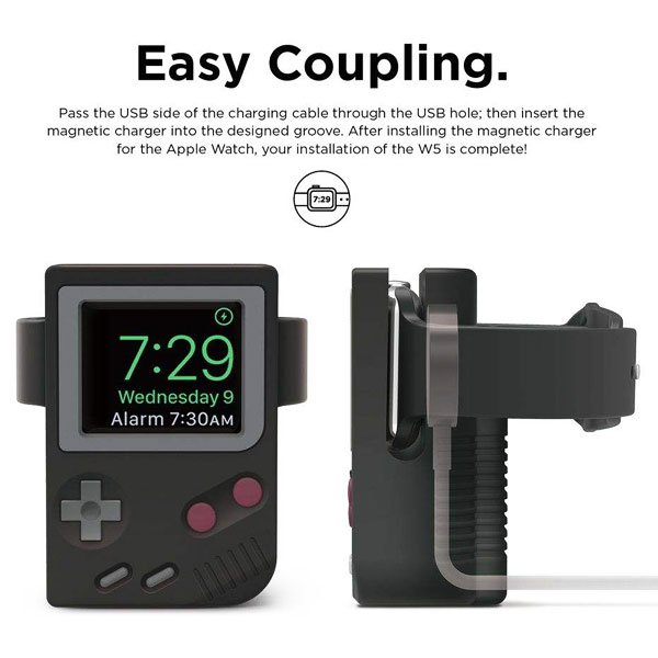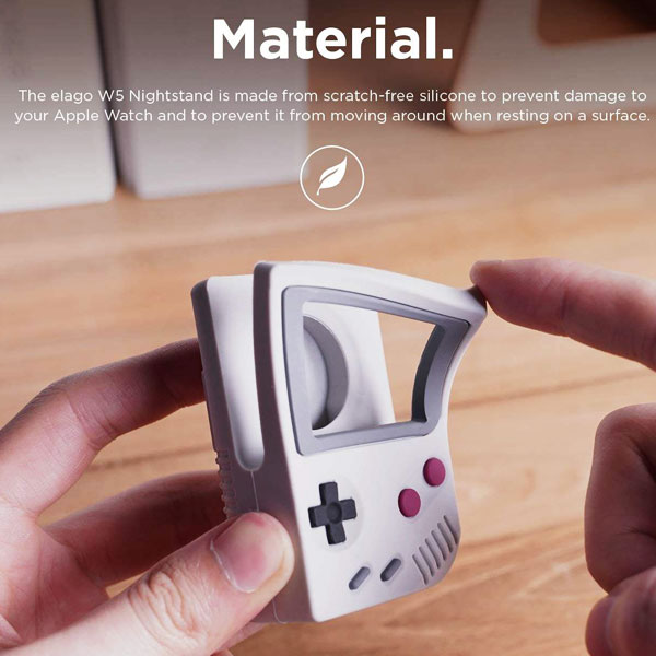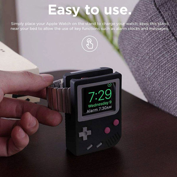 پایه نگهدارنده الاگو یکی از جدیدترین اکسسوری های برند معتبر الاگو است که طراحی آن یادآور بازی گیم های قدیمی است . این پایه از طریق رد شدن کابل شارژ در داخل آن به صورت ایستاده قرار میگیرد و اپل واچ شما را به صورت ایستاده بر روی میز شما همانند ساعت رومیزی شارژ میکند، لازم به ذکر است که دکمه های روی آن جنبه تزیینی داشته و سبب زیبایی ظاهر آن شده است. طراحی نوستالژیکی این محصول و کیفیت ساخت بالای آن از ویژگی های این محصول می باشد.
