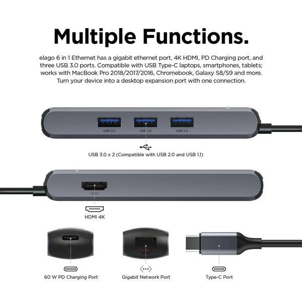با مـا تمـاس بگیـریـدبرند الاگو یکی از معتبرترین برندها در زمینه لوازم جانبی است که علاوه بر تمرکز تولید آن بر ظاهر زیبا و شیک آن، به کاربردی بودن اکسسوری ها توجه ویژه ای دارد. این هاب با دارا بودن ۶ خروجی بسیار کاربردی میتواند همراه همیشگی گوشی موبایل سامسونگ یا مک بوک تان باشد که دارای یک پورت 1000M Gigabit Ethernet، یک خروجی HDMI برای Screen Mirror کردن صفحه نمایش بر روی تلویزیون با کیفیت HD و ۳ پورت USB 3.0 (با سرعت انتقال ۱۰ برابر بیشتر از USB 2.0) و یک پورت شارژ PD می باشد. این هاب از جنس آلومینیوم ساخته شده است و وزن سبکی دارد و به راحتی میتوان آن را حمل کرد. این مدل هاب یکی از جدیدترین هابهای برند الاگو است